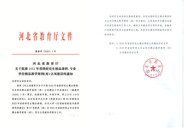 近日,河北省教育廳下發(fā)《河北省教育廳關(guān)于批準2023年省級研究生精品課程、專業(yè)學位精品教學案例(庫)立項建設的通知》(冀教研〔2023〕5號),批準河北大學《網(wǎng)絡安全》等5項課程為2023年省級研究生精品課程,河北大學《無損檢測新技術(shù)教學案例庫建設》等5項案例(庫)為2023年省級研究生專業(yè)學位精品教學案例(庫)。