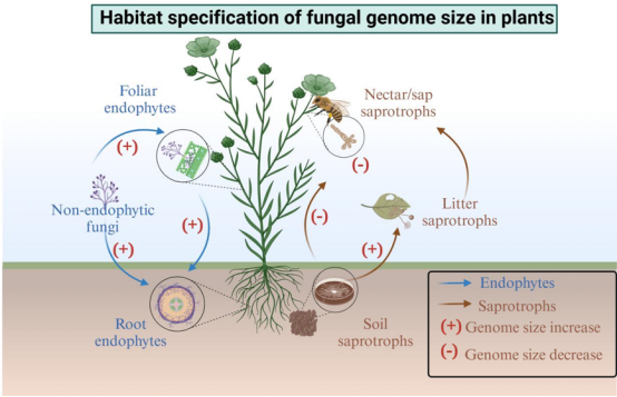 圖2. 不同植物組織特定微環(huán)境下的內(nèi)生真菌和腐生真菌群落的基因組大小